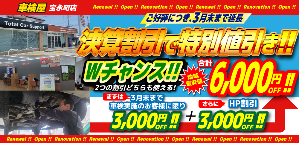 決算割引として、3月31日までに車検実施のお客様に限り、上記金額を割引させて頂きます。