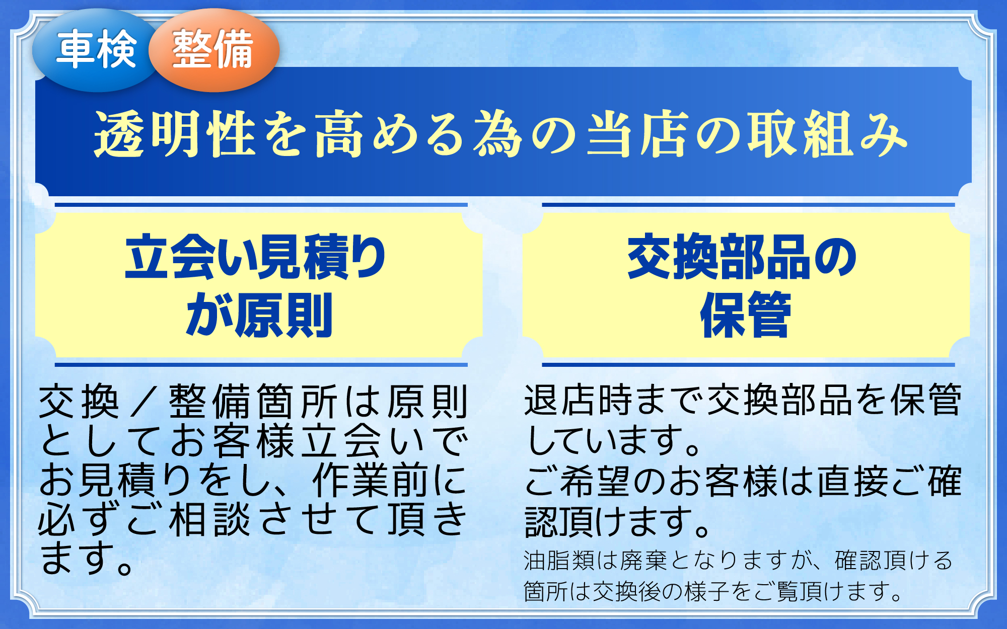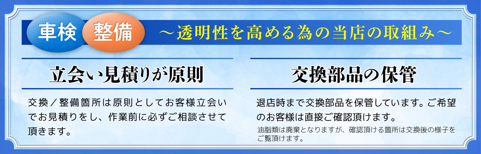 当車検工場では車検整備などを中心としているため、ディーラーのように自動車販売専門の営業マンはおりません。 また、人件費だけでなくチラシ費用もなるべく抑え、高知・土佐・南国・香南・香美市エリアのお客様に還元出来るよう努めています。